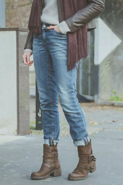 8. For a sleek, city-ready appearance, don a leather jacket over a comfortable top, paired with your trusty boots.