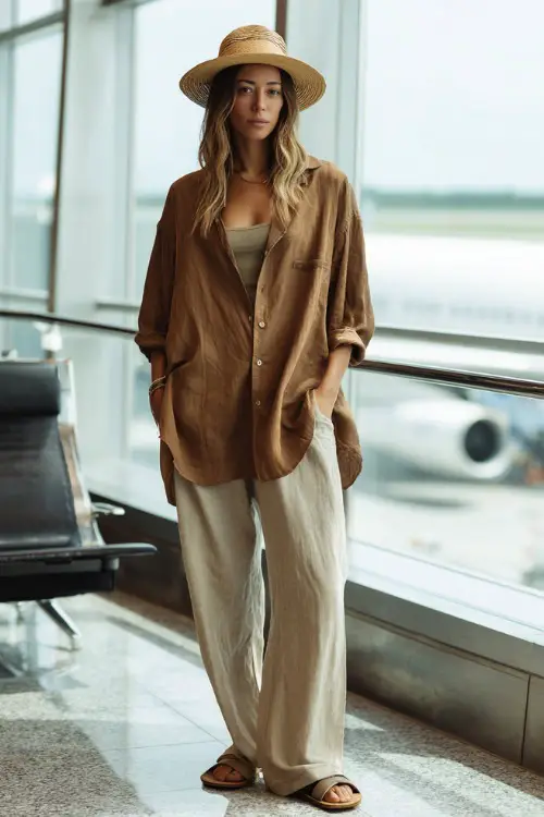 A loose-fit linen top paired with wide-leg linen pants creates a breezy, matching set that feels light and stylish at the same time.