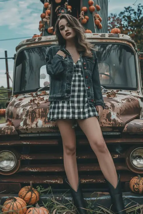 14. A red gingham dress paired with a denim jacket creates a fun and retro-inspired look.