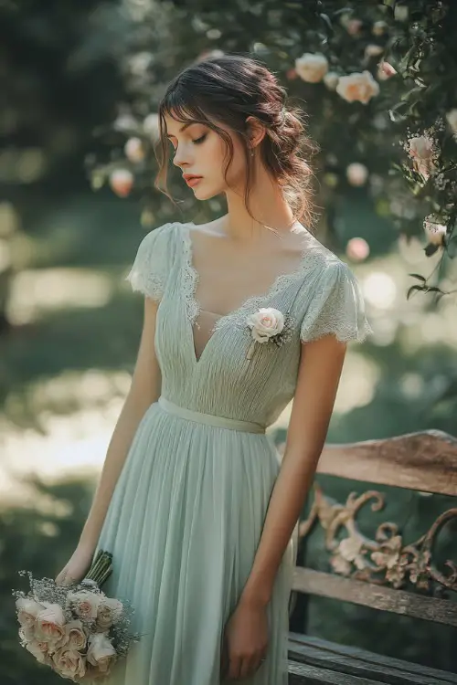 1. Introduce a touch of grace to your spring wedding look with a flowing mint green dress. Featuring delicate lace cap sleeves and a deep V-neckline, this design exudes charm.