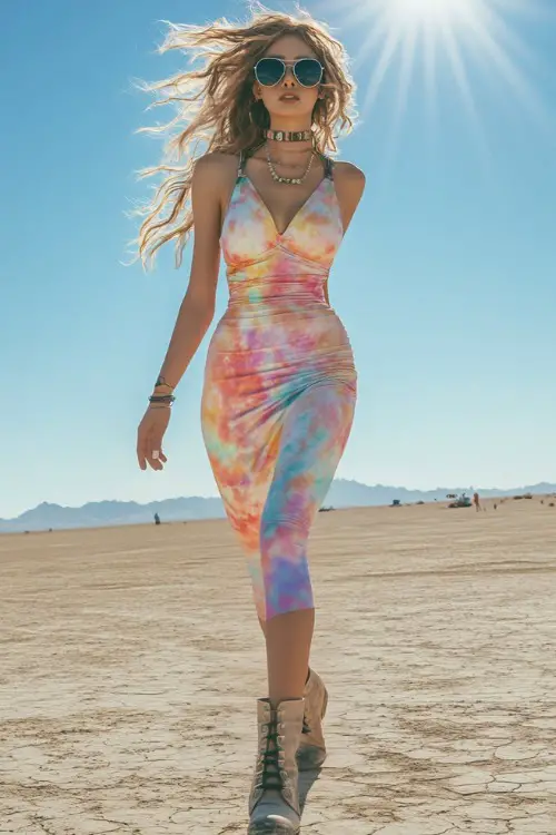 8. Go for a tie-dye bodycon midi dress with a plunging neckline and criss-cross back for a sexy yet chill look. The dress hugs your curves and keeps you cool.