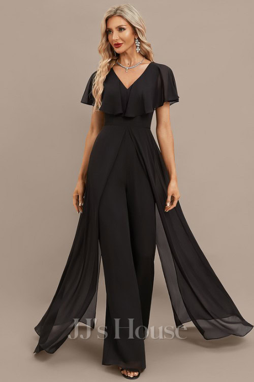 24. A black wide-leg jumpsuit with fluttery sleeves and flowing sheer layers is ideal for an indoor concert or lounge setting.