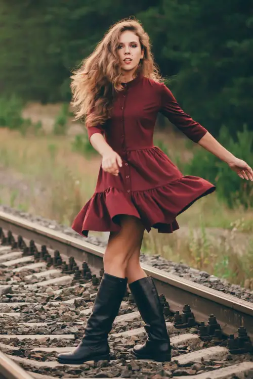 5. A twirl-worthy burgundy dress with a playful hemline pairs beautifully with classic black cowboy boots.