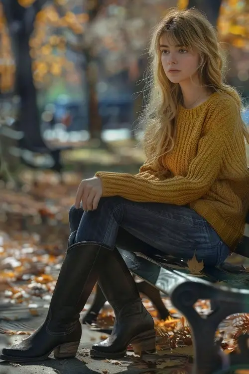 7. A mustard sweater paired with dark jeans and black cowboy boots creates a warm and earthy outfit.