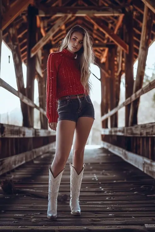 3. A red ribbed sweater paired with dark denim shorts and white cowboy boots is a bold and stylish choice for a casual day out.