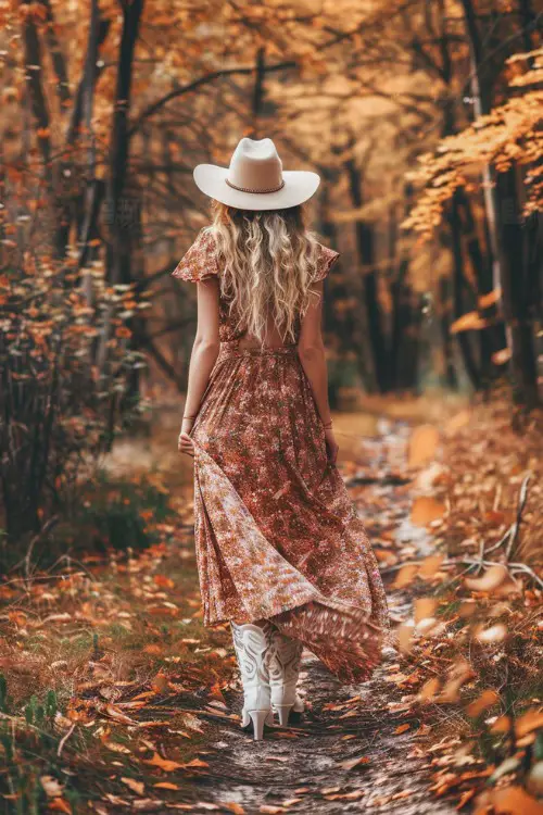 12. A floral maxi dress with a mix of warm fall colors pairs wonderfully with white cowboy boots for a serene autumn stroll.