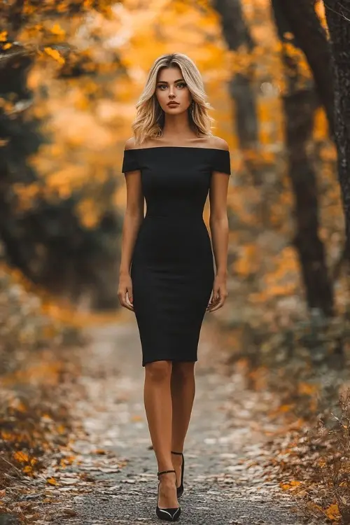4. An off-the-shoulder black midi dress exudes effortless glamour. The dress is ideal for those who want to look chic without too much fuss.