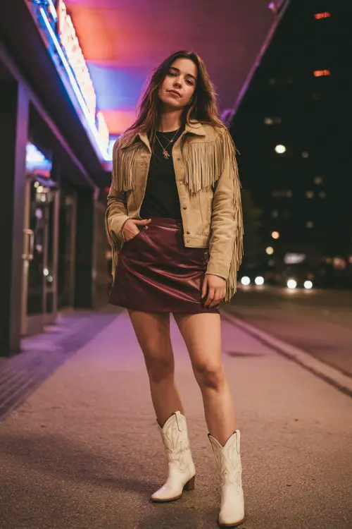 2. When the night calls for something daring, a suede fringe jacket over a black tee and burgundy leather skirt captures that Western-rocker mood.