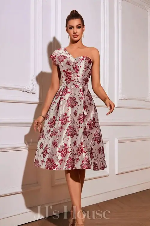A one-shoulder floral fit-and-flare dress brings a modern silhouette while keeping a romantic touch through the print.