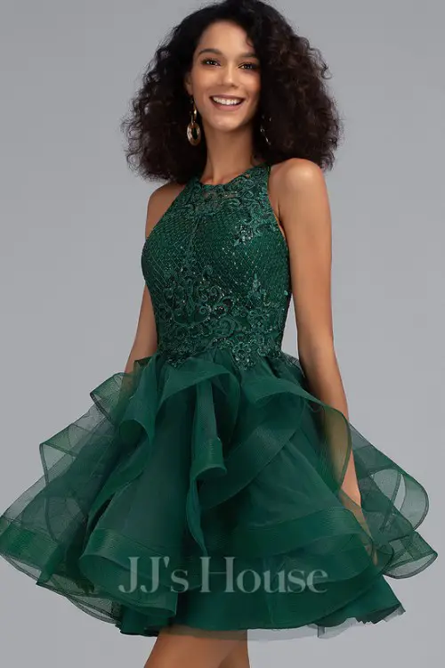 2. If you’re ready to twirl into the night, this emerald green mini dress with a dramatic layered tulle skirt is the moment.