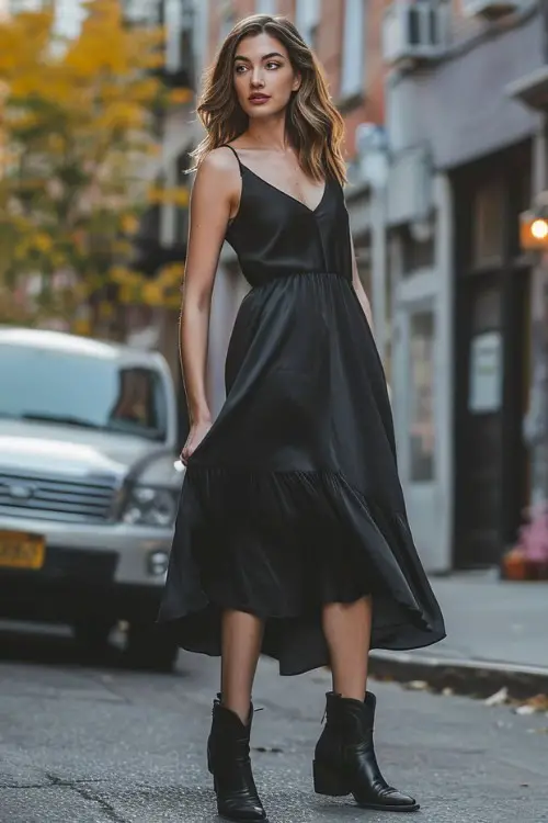 The flowy dress contrasts beautifully with the structured boots, offering an outfit perfect for a summer dinner date or a night at the theater.