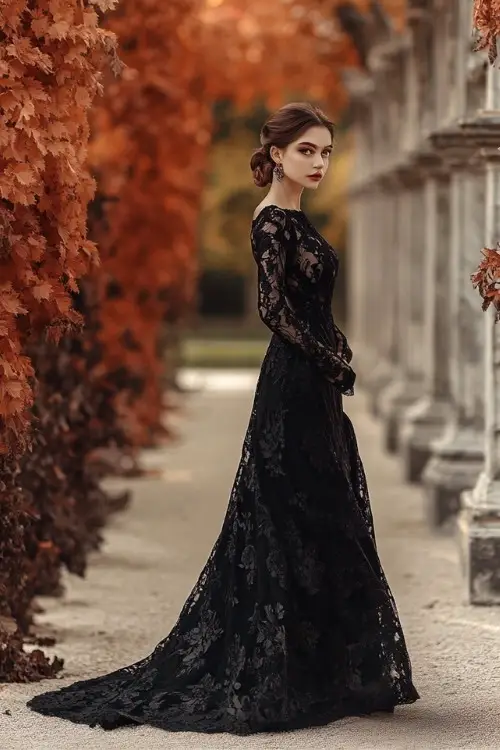 7. An elegant black lace evening gown features sheer lace detailing along the bodice and sleeves, creating a dramatic yet refined look.