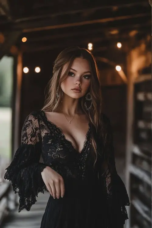 7. For a romantic yet elegant vibe, a black lace dress with bell sleeves offers a sophisticated silhouette.