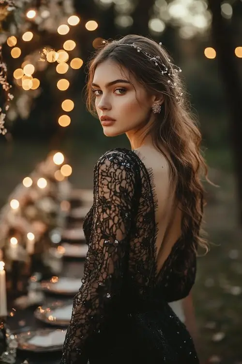 6. A black lace gown with a dramatic open back creates a striking look for any wedding. The long lace sleeves and detailed bodice add a touch of refinement.