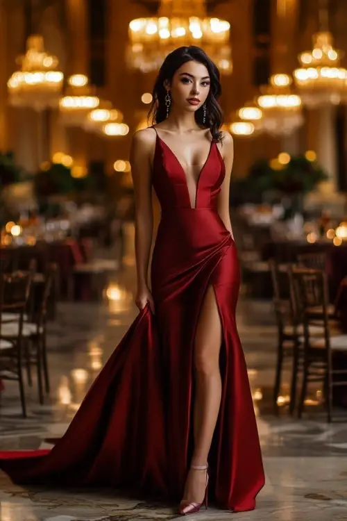 6. A bold red satin gown with a plunging neckline and high slit exudes confidence. The smooth satin fabric shines in evening lighting, perfect for formal indoor weddings.