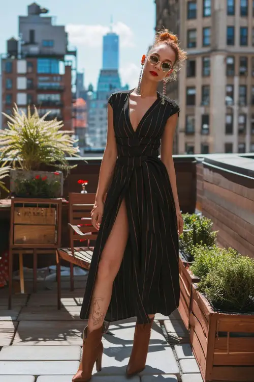 6. A black pinstripe dress with a thigh-high slit is a sharp and modern option, especially when paired with brown cowboy boots.