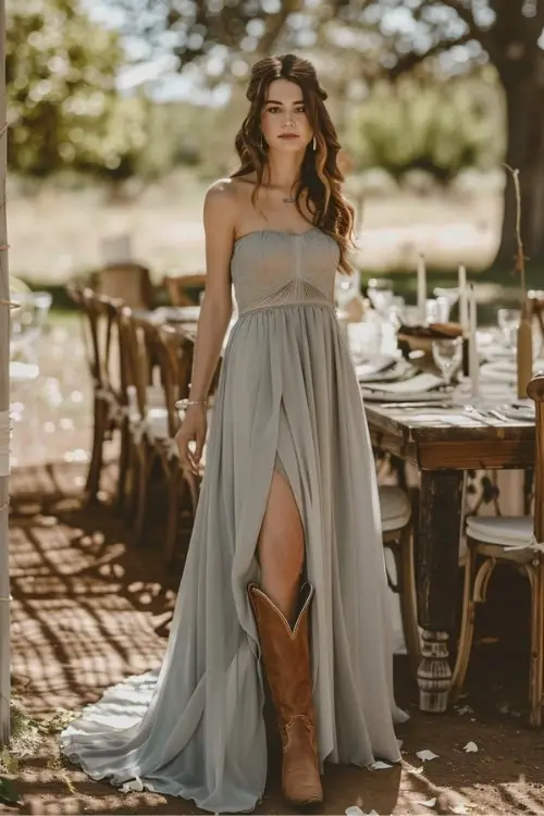 Long dresses with slits are the perfect canvas for showcasing your cowboy boots. The play of lengths adds intrigue and allure to your look, perfect for a range of occasions.
