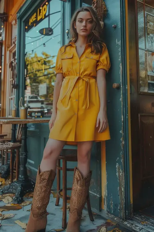 3. A button-front yellow shirt dress paired with dark brown cowboy boots creates a modern and casual outfit.